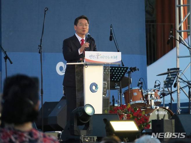[인천=뉴시스] 김동영 기자 = 유정복 인천시장이 1일 오후 인천시 중구 북성동1가 상상플랫폼 야외공연장에서 열린 취임식에서 취임사를 하고 있다. 2022.07.01. dy0121@newsis.com