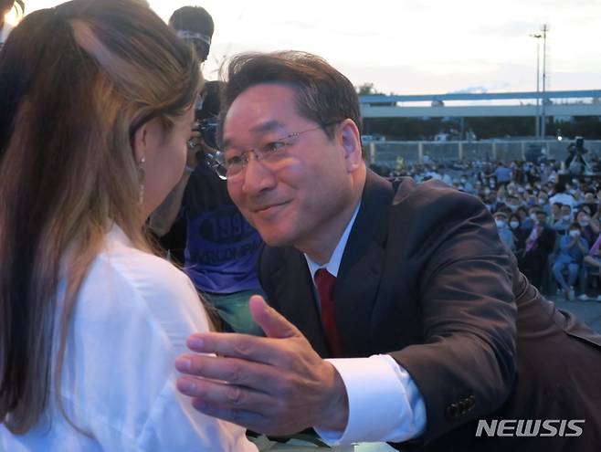 [인천=뉴시스] 김동영 기자 = 유정복 인천시장이 1일 오후 인천시 중구 북성동1가 상상플랫폼 야외공연장에서 열린 취임식에서 시민들에게 꽃다발을 전달하고 있다. 2022.07.01. dy0121@newsis.com