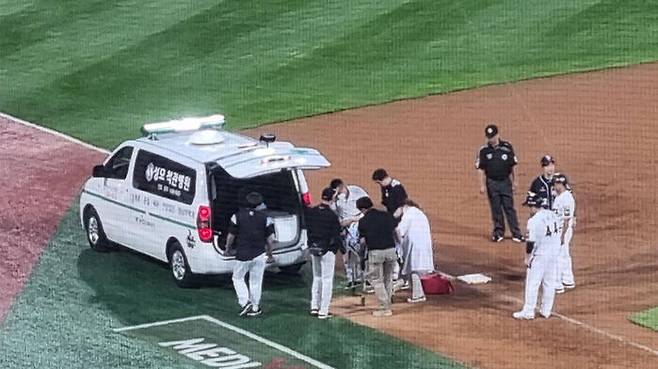 고통을 호소하던 강백호는 경기장으로 들어온 구급차를 타고 인근 병원으로 옮겨졌습니다.