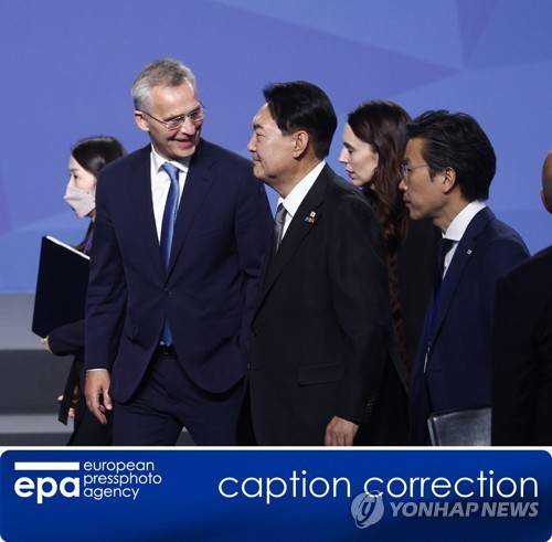 NATO Secretary General Jens Stoltenberg (L) chats with South Korea's President Yoon Suk-yeol (C) after a press conference on the first day of the NATO Summit at IFEMA Convention Center, in Madrid, Spain, 29 June 2022. Heads of State and Government of NATO's member countries and key partners are gathering in Madrid from 29 to 30 June to discuss security concerns like Russia's invasion of Ukraine and other challenges. Spain is hosting 2022 NATO Summit coinciding with the 40th anniversary of its accession to NATO. EPA/RODRIGO JIMENEZ (CORRECTION)