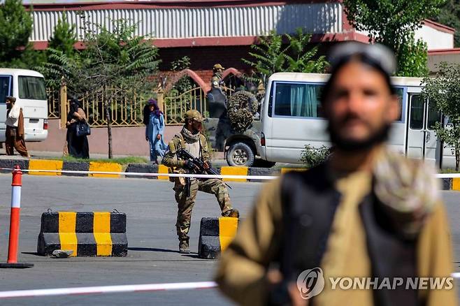 (카불 EPA=연합뉴스) 지난달 30일(현지시간) 아프가니스탄 수도 카불에서 탈레반 대원들이 아프간 전통 부족 원로회의인 '로야 지르가'(Loya Jirga)가 열리는 회의장 주변을 지키고 있다. 탈레반은 지난해 8월 아프간 장악 이후 이날 3천여 명이 모인 최대 규모의 지도자 회의를 개최해 체제 장악력을 과시했다. 2022.7.1