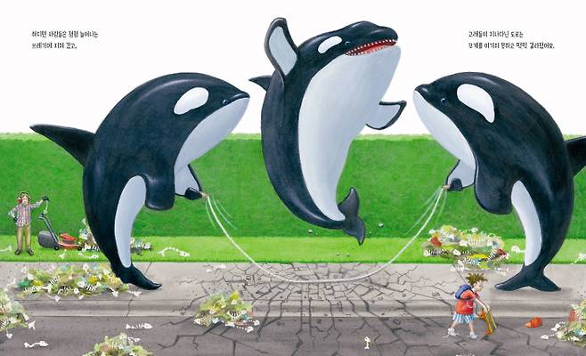 도시를 더럽히고 파괴하는 고래들의 모습은 인간의 모습과 닮아 있다. 고래들이 그랬던 것처럼, 사람들은 ‘무심코’ 쓰레기를 바다에 버린다. 그 대가로 고래들은 삶의 터전을 잃는다. 왜 환경을 보호해야 하는지, 무겁게 설교하지 않고 재치 있고 예리하게 ‘역지사지’로 알린다. 이 책에서 가장 아름다운 그림은 마지막 페이지에 있다. 작은 배에 탄 두 사람과 그 아래 물속을 헤엄치는 두 고래. 사람은 뭍에, 고래는 물에 있을 때 가장 행복하다.
