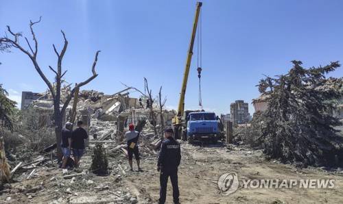 epa10045468 Rescuers work at the scene of a destroyed building after shelling hit the small town of Serhiivka near Odesa, southern Ukraine, 01 July 2022. At least 19 people were killed and 38 others injured, including six children, after overnight shelling hit a nine-story building and two holiday hotels in Serhiivka, Bilhorod-Dnistrovskyi district, Odesa region, the state emergency service said in a statement on 01 July. EPA/STRINGER