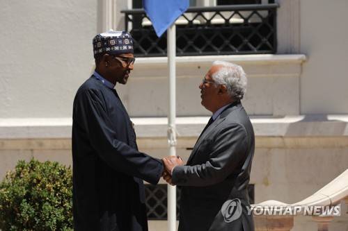 epa10045473 Portugal's Prime Minister Antonio Costa (R) welcomes Nigeria's President Muhammadu Buhari (L) prior to a meeting at Sao Bento Palace in Lisbon, Portugal, 01 July 2022. EPA/MIGUEL A. LOPES