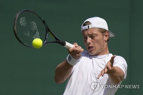 Tim van Rijthoven of the Netherlands returns the ball to Georgia's Nikoloz Basilashvili in a third round men's singles match on day five of the Wimbledon tennis championships in London, Friday, July 1, 2022. (AP Photo/Alastair Grant)