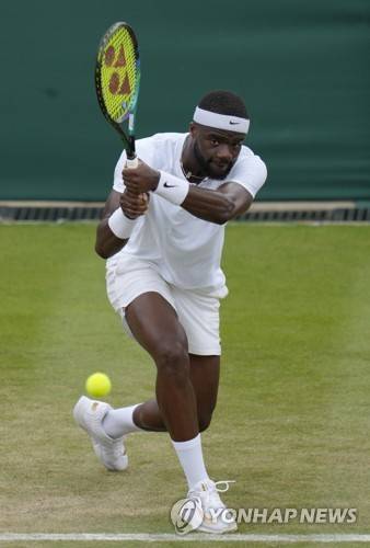 Frances Tiafoe of the US returns to Kazakhstan's Alexander Bublik during their men's third round singles match on day five of the Wimbledon tennis championships in London, Friday, July 1, 2022. (AP Photo/Kirsty Wigglesworth)
