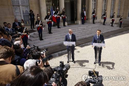 French President Emmanuel Macron, right, and Australian Prime Minister Anthony Albanese address reporters Friday, July 1, 2022 at the Elysee Palace in Paris. Australia and France opened a "new chapter" in relations as the new Australian prime minister seeks to heal wounds caused by a secret submarine contract that infuriated France. (AP Photo/ Thomas Padilla)