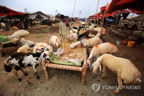 epa10045519 Sheep are on sale at a market ahead of the Muslim festival Eid Al-Adha, in Peshawar, Pakistan, 01 July 2022. Eid al-Adha is one of the holiest Muslims holidays of the year. It marks the yearly Muslim pilgrimage, known as Hajj, to visit Mecca. During Eid al-Adha Muslims will slaughter an animal and split the meat into three parts; one for family, one for friends and relatives, and one for the poor and needy. EPA/BILAWAL ARBAB