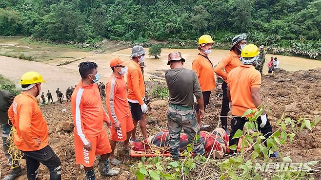 [노니=AP/뉴시스] 1일(현지시간) 인도 마니푸르주 노니에서 산사태가 발생해 구조대가 희생자 시신을 수습하고 있다. 구조대는 전날까지 이어진 폭우로 노니의 철도 건설 현장에서 산사태가 발생, 최소 19명이 숨지고 약 70명이 실종됐다고 밝혔다. 2022.07.01.