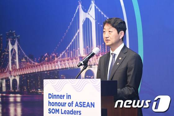 (서울=뉴스1) = 안덕근 산업통상자원부 통상교섭본부장이 1일 서울 중구 신라호텔 토파즈홀에서 브루나이, 캄보디아, 인도네시아, 필리핀 등 아세안 10개 회원국 차관급 대표 60여명이 참석한 가운데 열린 '2030 부산세계박람회 유치를 위한 한-아세안 만찬'에 참석해 환영사를 하고 있다.(산업통상자원부 제공)2022.7.1/뉴스1