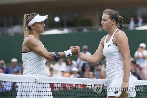Germany's Jule Niemeier, right, shakes hands with Ukraine's Lesia Tsurenko after defeating her in a third round women's singles match on day five of the Wimbledon tennis championships in London, Friday, July 1, 2022. (AP Photo/Alberto Pezzali)