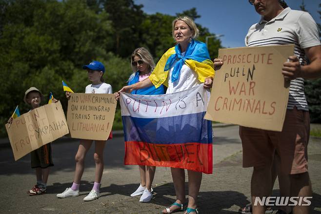 [빌뉴스=AP/뉴시스] 1일(현지시간) 리투아니아 빌뉴스의 러시아 대사관 앞에서 시민들이 러시아의 우크라이나 침공에 반대하는 시위에 참여하고 있다. 우크라이나 당국은 러시아군이 항구도시 오데사의 주거지를 공습해 최소 17명이 숨졌다고 밝혔다. 2022.07.01.