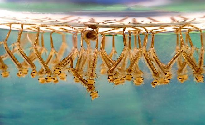 | ▲ 빗방울 속의 장구벌레. 모기의 피해를 줄이려면 고인물을 만들지 않아야 한다. |