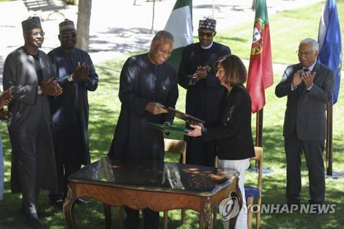 epa10045606 Portugal's Prime Minister Antonio Costa (R) and Nigeria's President Muhammadu Buhari (3-R) applaud the signing agreements ceremony between the two countries by the Portuguese Minister of State and Parliamentary Affairs Ana Catarina Mendes (2-R) and by Nigerian Minister of Foreign Affairs Geoffrey Onyeama (3-L) after a meeting at the Sao Bento Palace in Lisbon, Portugal, 01 July 2022. EPA/MIGUEL A. LOPES