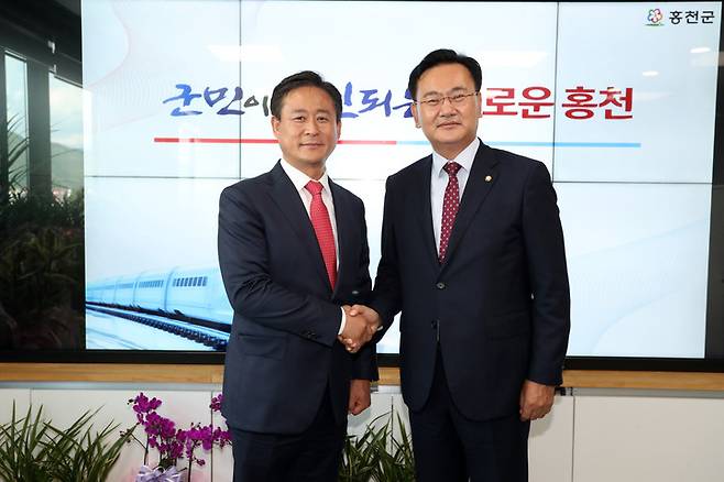 [홍천=뉴시스] 김경목 기자 = 민선 8기가 시작된 1일 오전 유상범(오른쪽) 국민의힘 국회의원이 강원 홍천군 군청을 방문해 신영재 군수의 취임을 축하하고 있다. (사진=정선군청 제공) 2022.07.01. photo@newsis.com