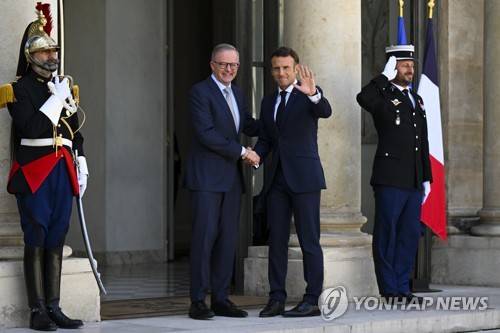 epa10045632 Australian Prime Minister Anthony Albanese (left) is greeted by French President Emmanuel Macron at Elysee Palace in Paris, France, 01 July 2022. Mr Albanese is in France on a two-day official visit in a bid to repair the relationship with French President Emmanuel Macron. EPA/LUKAS COCH AUSTRALIA AND NEW ZEALAND OUT