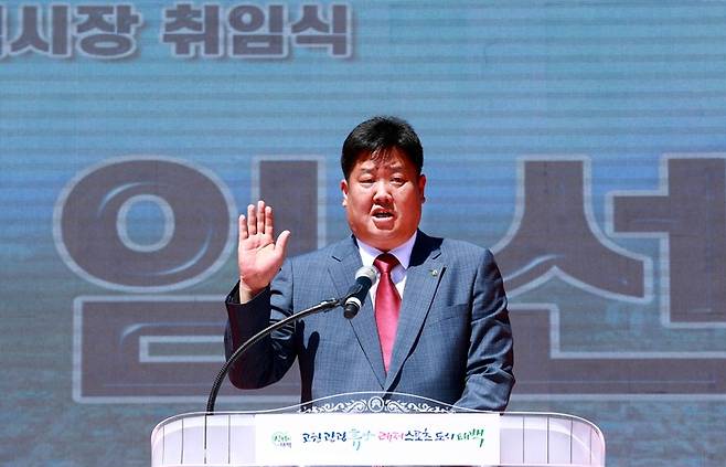 [태백=뉴시스] 김경목 기자 = 민선 8기가 시작된 1일 오전 이상호 태백시장이 강원 태백시 시청 광장에서 열린 취임식에서 선서를 하고 있다. (사진=태백시청 제공) 2022.07.01. photo@newsis.com