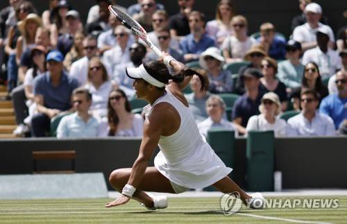 epa10045679 Heather Watson of Britain slips and falls in the women's third round match against Kaja Juvan of Slovenia at the Wimbledon Championships, in Wimbledon, Britain, 01 July 2022. EPA/TOLGA AKMEN EDITORIAL USE ONLY