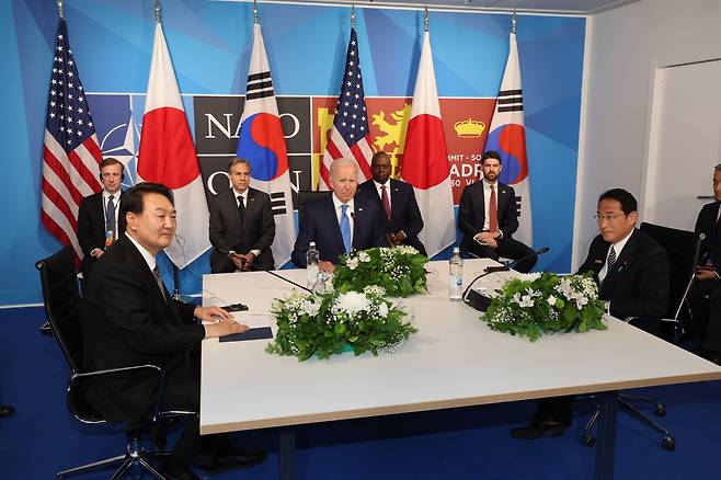 | ▲ 윤석열 대통령이 29일 스페인 마드리드 이페마(IFEMA) 컨벤션센터에서 한미일 정상회담을 하고 있다. 왼쪽부터 윤 대통령, 조 바이든 미국 대통령, 기시다 후미오 일본 총리. |