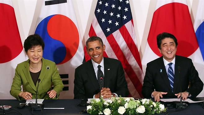 | ▲ 밝은 표정 한미일 정상 2014년 3월 25일, 박근혜 대통령, 버락 오바마 미국 대통령, 아베 신조 일본 총리가 네덜란드 헤이그 미대사관저에서 한미일 정상회담을 하고 있다. |