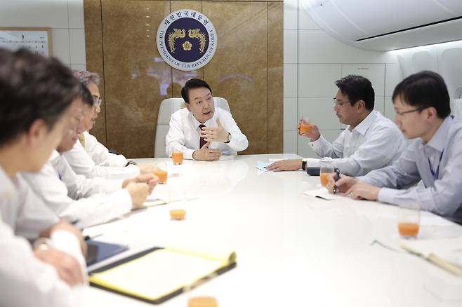 | ▲ 윤석열 대통령이 1일 북대서양조약기구 정상회의 참석을 마치고 귀국길 공군 1호기에서 참모회의를 하고 있다. |