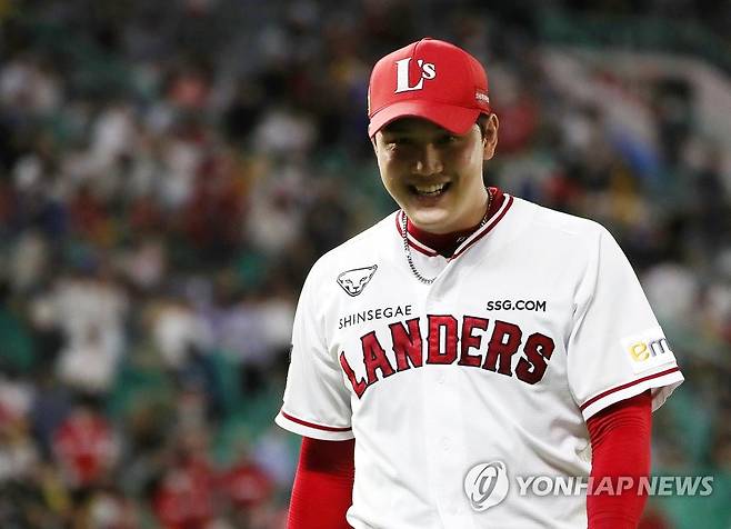 (인천=연합뉴스) 윤태현 기자 = 1일 인천 SSG 랜더스필드에서 열린 프로야구 SSG 랜더스와 KIA 타이거즈의 경기. 9회초 실점 위기를 넘기고 투구를 마친 SSG 서진용이 활짝 웃으며 더그아웃으로 들어오고 있다. 2022.7.1