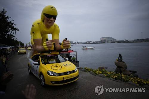 A giant cyclists, wearing the overall leader's yellow jersey, passes the Little Mermaid statue by Edvard Eriksen during the parade of sponsors prior to the first stage of the tour de France cycling race, an individual time trial over 13.2 kilometers (8.2 miles) with start and finish in Copenhagen, Denmark, Friday, July 1, 2022. (AP Photo/Daniel Cole)
