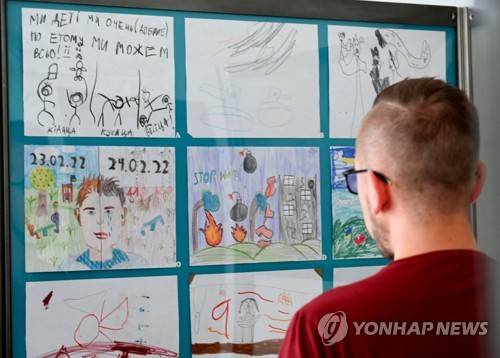 epa10045711 People look at drawings during the opening of the exhibition titled 'War drawn with a crayon' at the Pomeranian Dukes' Castle in Szczecin, West Poland, 01 July 2022. The exhibition includes several dozen drawings made by children from Ukraine suffering from the trauma of the war in their country. The exhibition was prepared by the West Pomeranian Society of Friends of Children. EPA/Marcin Bielecki POLAND OUT