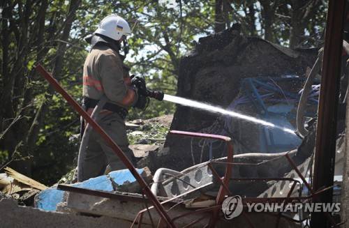 Ukrainian State Emergency Service firefighter works to extinguish a fire at at damaged residential building in the town of Serhiivka, located about 50 kilometers (31 miles) southwest of Odesa, Ukraine, Friday, July 1, 2022. Russian missile attacks on residential areas in a coastal town near the Ukrainian port city of Odesa early Friday killed at least 19 people, authorities reported, a day after Russian forces withdrew from a strategic Black Sea island. (AP Photo/Nina Lyashonok)