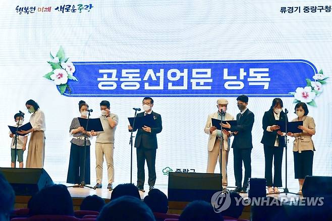 (서울=연합뉴스) 류경기 중랑구청장이 1일 오후 서울 중랑구민회관에서 열린 취임식에서 주민대표 8명과 함께 더 행복하고 더 새로운 중랑구를 만들기 위한 공동선언문을 낭독하고 있다. 2022.7.1 [중랑구청 제공. 재판매 및 DB 금지]