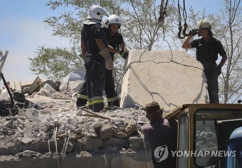 Ukrainian State Emergency Service firefighters take away debris at damaged residential building in the town of Serhiivka, located about 50 kilometers (31 miles) southwest of Odesa, Ukraine, Friday, July 1, 2022. Russian missile attacks on residential areas in a coastal town near the Ukrainian port city of Odesa early Friday killed at least 19 people, authorities reported, a day after Russian forces withdrew from a strategic Black Sea island. (AP Photo/Nina Lyashonok)
