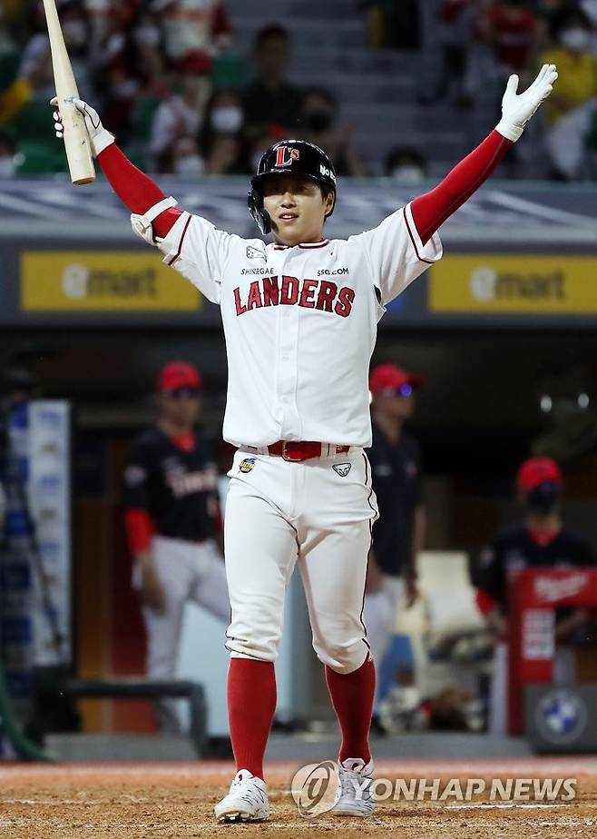 (인천=연합뉴스) 윤태현 기자 = 1일 인천 SSG 랜더스필드에서 열린 프로야구 SSG 랜더스와 KIA 타이거즈의 경기. 9회말 SSG 공격 2사 만루 상황에서 SSG 최상민이 볼넷으로 진루, 승리하게 되자 두 팔을 들어 올리며 기뻐하고 있다. 2022.7.1
