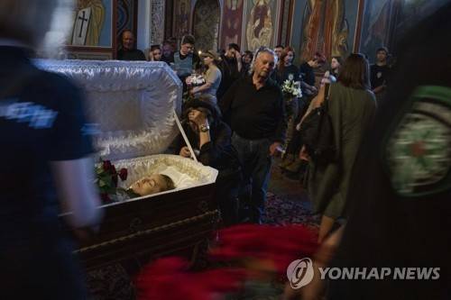 People pay their respects during the funeral of 46-year-old surgeon Natalia Frausher, part of the right-wing 'Hospitallers Medical Battalion,' after she was killed in a bus crash near frontlines, at St. Michael's Golden-Domed Monastery, in Kyiv, Ukraine, Thursday, June 30, 2022. (AP Photo/Nariman El-Mofty)