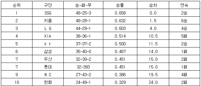 [프로야구 중간순위] 1일