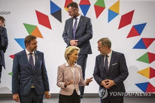 epa10045775 Czech Prime Minister Petr Fiala (R) and European Commission President Ursula von der Leyen (C) chat before family photo with members of Czech government and College of the European Commission during their visit on the very first day of the Czech Presidency of the EU Council, in Litomysl, Czech Republic, 01 July 2022. The Czech Republic's second presidency of the European Council begins 01 July 2022. EPA/MARTIN DIVISEK