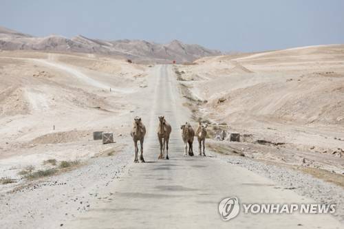 epa10045780 Herd of camels roam in Nabi Musa, located in the Judaean Desert near The West Bank city of Jericho, 01 July 2022. EPA/ABIR SULTAN