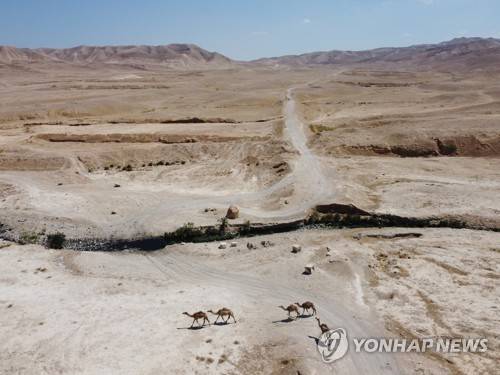 epa10045777 Herd of camels roam in Nabi Musa, located in the Judaean Desert near The West Bank city of Jericho, 01 July 2022. EPA/ABIR SULTAN