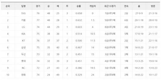[1일 팀 순위]SSG, KIA 5연패 늪으로 밀어넣고 불안한 1.5게임차 선두 자리 지켜..kt, 승률 5할에 복귀하며 4위 KIA에 1게임차로 따라 붙어