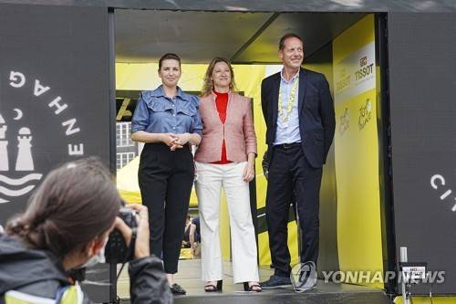 epa10045835 Danish prime minister Mette Frederiksen (L), Copenhagen mayor Sophie Haestorp Andersen (C), and Tour de France general director Christian Prudhomme (R) stand at the starting ppoint of the first stage of the Tour de France 2022 cycling race, an individual time trial over 13.2km in Copenhagen, Denmark, 01 July 2022. EPA/Bo Amstrup DENMARK OUT