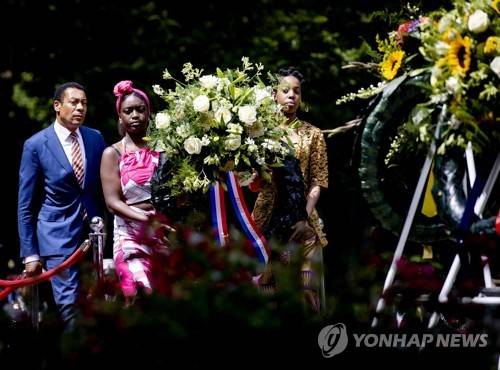 epa10045853 Franc Weerwind (L), Minister for Legal Protection, attends a ceremony at the National Monument to Slavery Past, during the national commemoration of the Dutch slavery past in Amsterdam, The Netherlands, 01 July 2022. On 01 July 1863, slavery was abolished by law in Suriname and the Caribbean part of the Dutch Kingdom. EPA/KOEN VAN WEEL