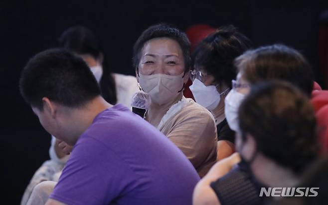 [서울=뉴시스] 조수정 기자 = 다큐멘터리 영화 '니얼굴(감독 서동일)' 관객과의 대화가 열린 1일 오후 서울 서대문구 이화여자대학교 내 아트하우스모모에서 정은혜 작가 어머니 장차현실 씨가 관객들의 질문에 답하고 있다. 2022.07.01. chocrystal@newsis.com