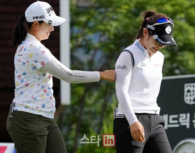 [이데일리 골프in=용평 조원범 기자]1일 강원 용평에 위치한 버치힐(파72ㅣ6434야드)에서 '맥콜 모나파크 오픈 with SBS Golf'(총상금 8억 원, 우승상금 1억4천4백만 원)1라운드가 열렸다.박채윤,이소영의 10번홀 경기 장면.