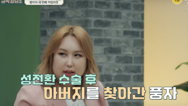 풍자는 “성전환 수술 후 아버지를 찾아갔고, 아버지는 나를 죽어도 이해 못하겠다고 했다”며 커밍아웃을 완강히 부정했다며 “얘기도 중, 계속 너의 뜻(여자로 살겠다는)을 굽히지 않을 거라면 이 칼로 나를 찌르고 가라고 말씀 하셨다”며 6시간 이상 긴 시간동안 아버지와 칼을 앞에 두고 대화를 했다고 했다.
