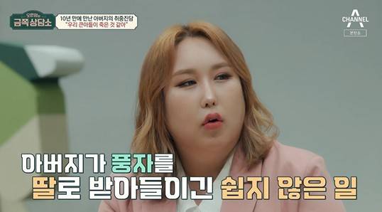 이어 풍자는 가족에게 커밍아웃을 할 때의 과정을 털어놨다. 아버지에게 커밍아웃을 세 번 정도 했다며 세 번째는 성전환 수술 후 아버지를 찾아갔다며 긴 시간 동안 대화를 시도했지만 아들이 아닌 딸로서 아버지의 이해를 받지 못했고 그 이후로 10년 동안 연락을 하지 않고 지냈다는 것. 이어 어느 날 갑자기 아버지의 전화가 와서 ‘된장찌개 해줄테니까 집으로 와’라고 말했고 그 이후 10년 만에 가족과 다시 만났다고 털어놨다.