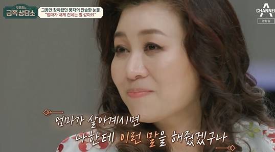 또한 스스로 세상을 등진 어머니 곁에서 홀로 일주일간 임종까지 지켰다는 아픔을 고백한 풍자는 “내가 자는 사이에 엄마가 돌아가실까봐 잠을 자지 못했다. 제가 잠을 자고 있을 때 약을 드셨다. 어머니 빈소에 앉아서 든 생각이 '왜 그때 잠을 잔 걸까',라는 생각이 들었다”라고 어머니가 돌아가신게 자신의 탓처럼 느껴졌다고 털어놓으며 안타까움을 자아냈다.