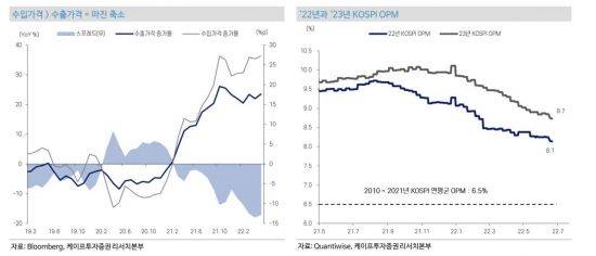 코스피 영업이익률 역시 지속적으로 하향 조정되는 중이다. 러시아-우크라이나 전쟁 발발 이후 에너지, 원자재 가격 상승 여파로 수출 가격 대비 수입 가격의 상승 속도가 더 빠르다. 원유 및 주요 원자재 가격 상승은 국내 제조업 기업의 원가를 높이기 때문에 영업이익률이 하향 조정되는 결과를 낳는다. 연초 예상과 달리 전쟁이 장기화함에 따라 높은 원자재 가격이 유지되면서 코스피의 영업이익률이 하향 조정되고 있다. 나정환 케이프투자증권 연구원은 "2분기 실적 발표를 전후로 코스피 실적이 하향 조정될 경우, 영업이익률도 추가적으로 하향 조정될 것"이라고 판단했다.