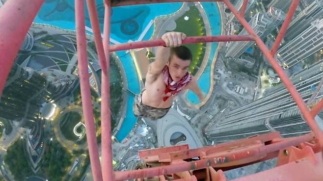 영국의 한 자유 등반가가 아무런 장비 없이 두바이에서 가장 높은 크레인(기중기)에 올라 한 손으로 매달리는 영상을 공개했습니다.