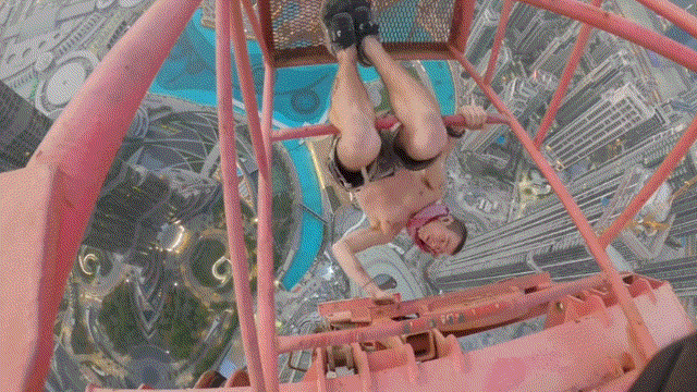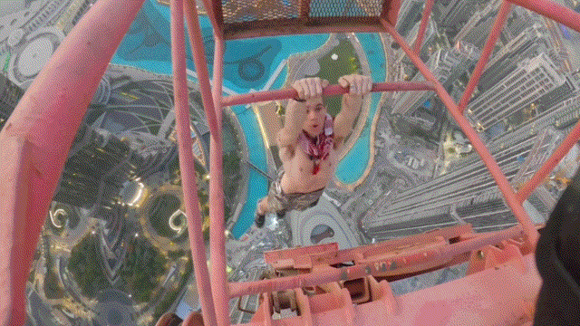 공개된 영상을 보면 록우드는 어떠한 안전 장비도 착용하지 않고 크레인에 대롱대롱 매달려 있습니다. 그는 한쪽 손을 놓더니 자전거 페달을 돌리듯 다리를 움직이고, 까마득하게 내려다보이는 두바이 전경을 카메라에 담기도 합니다.