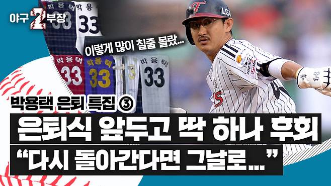 ‘야구2부장’이 박용택과 나눈 허심탄회한 이야기를 전한다. 은퇴택 특집 3번째 이야기에서는 박용택의 어깨가 왜 약해졌는지, LG 커리어 동안 가장 아쉬운 것은 무엇인지, 그리고 만약 딱 한 번만 과거로 돌아갈 수 있다면 어디로 돌아가고 싶은지에 대해 물었고, 그 답을 들었다.