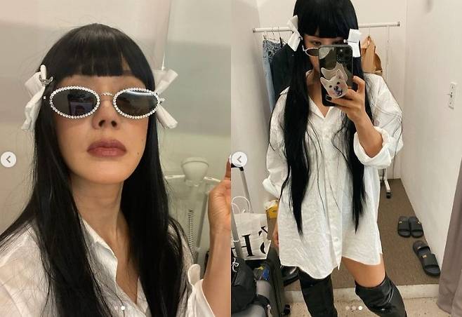 사진에는 뱅헤어 스타일에 화이트 룩, 장식이 박힌 선글라스를 끼고 힙한 매력을 드러낸 엄정화의 모습이 담겨있다.